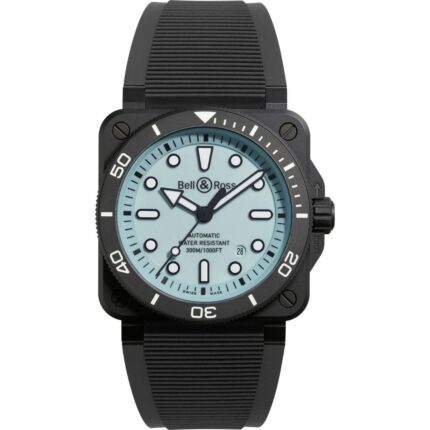 The Bell & Ross BR 03 Diver Full Lum Ceramic BR03A-D-LM-CE/SRB redefines the professional tool watch. Its 42mm matte black ceramic case houses a stunning pale blue fully-luminous dial. Powered by an automatic movement and water-resistant to 300m, it delivers robust performance and sophisticated, after-dark presence for the discerning adventurer.
