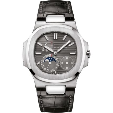 The Patek Philippe Nautilus 5712G-001 pairs iconic design with refined complications. Featuring a slate grey embossed dial, 18k white gold case, and denim-patterned alligator strap, it offers moon phase, date, power reserve, and small seconds, powered by the ultra-thin self-winding Caliber 240 PS IRM C LU.