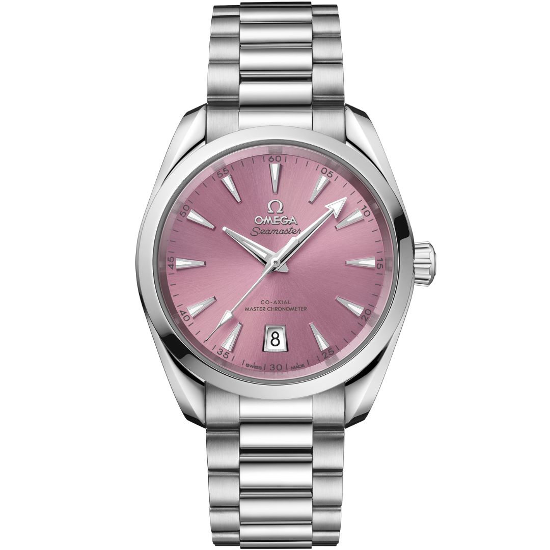 The Omega Seamaster Aqua Terra Shades 220.10.38.20.10.005 pairs stainless steel strength with a radiant shell pink sunray dial. Powered by the Co-Axial Master Chronometer Caliber 8800, it blends precision and elegance, offering water-ready resilience and refined luxury for modern lifestyles with enduring prestige.