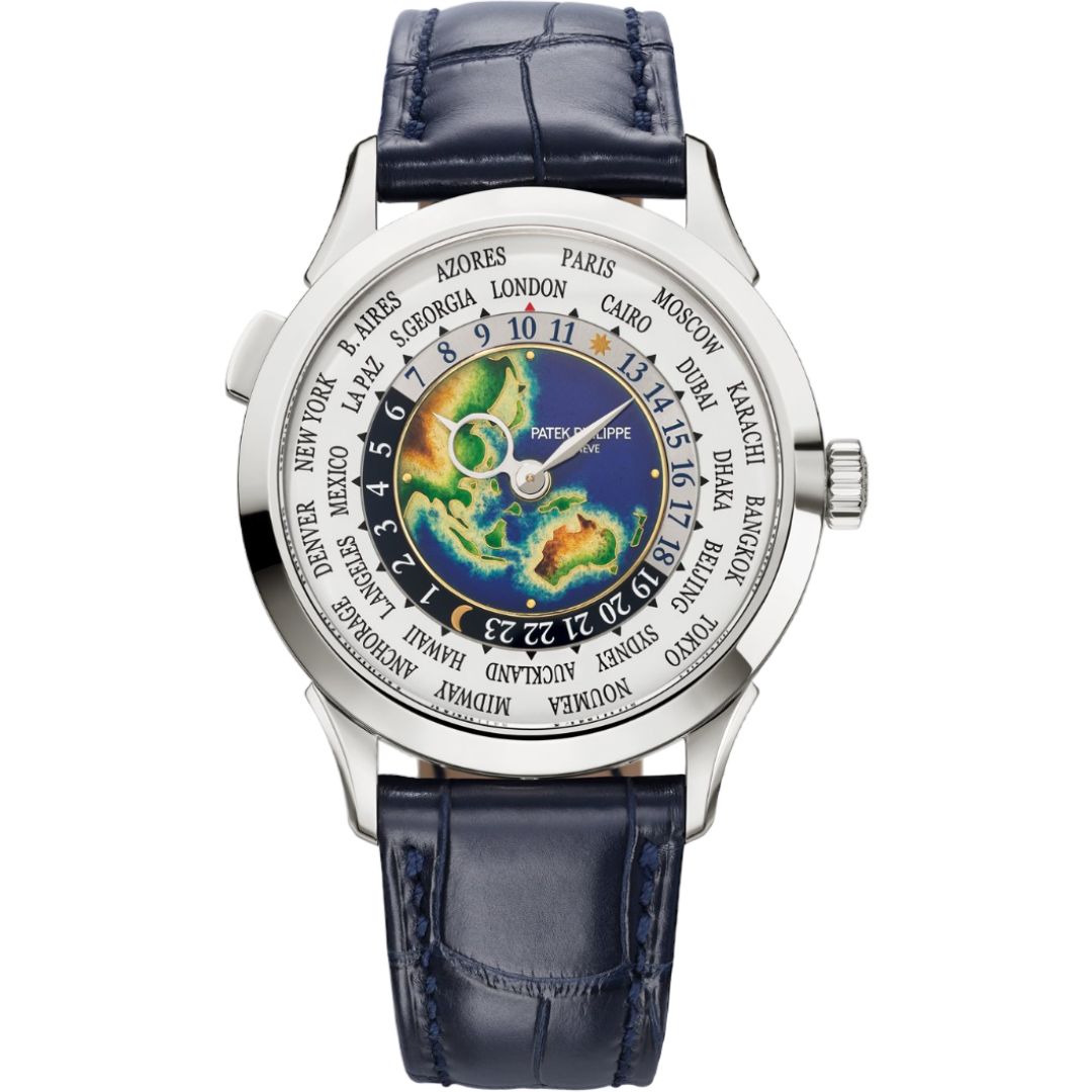 Patek Philippe Complications 5231G-001 in white gold features a Grand Feu cloisonné enamel world map dial, showcasing world-time mastery—a poetic celebration of global travel, artistry, and timeless refinement.