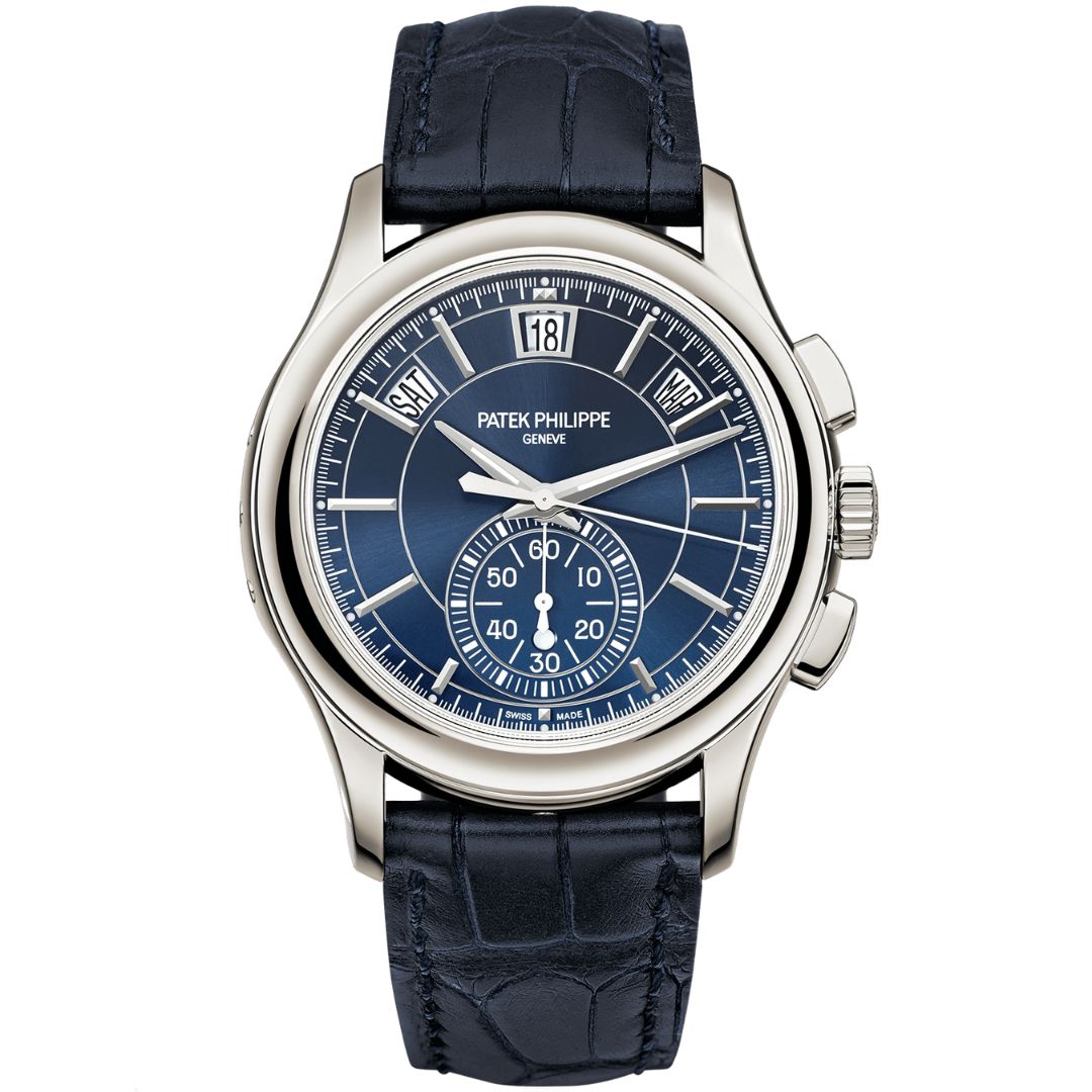 The Patek Philippe Complications 5905P-001 luxury watch pairs a platinum case with a blue sunburst dial and a refined flyback chronograph, offering modern prestige and technical mastery in a beautifully balanced design.