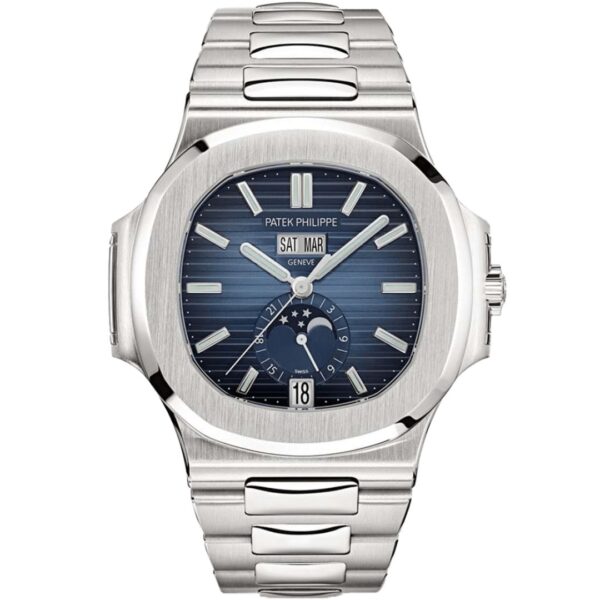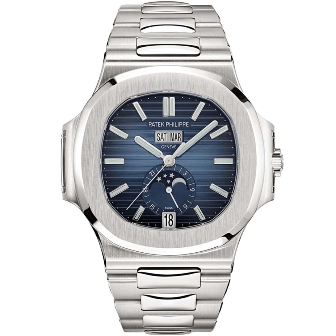 The Patek Philippe Nautilus Annual Calendar 5726/1A-014 in stainless steel combines sport-luxury design with refined complications. Its blue gradient, horizontally embossed dial houses an annual calendar, moon phase, and 24-hour display—powered by the self-winding Caliber 324—embodying Patek Philippe’s effortless sophistication for the modern connoisseur.