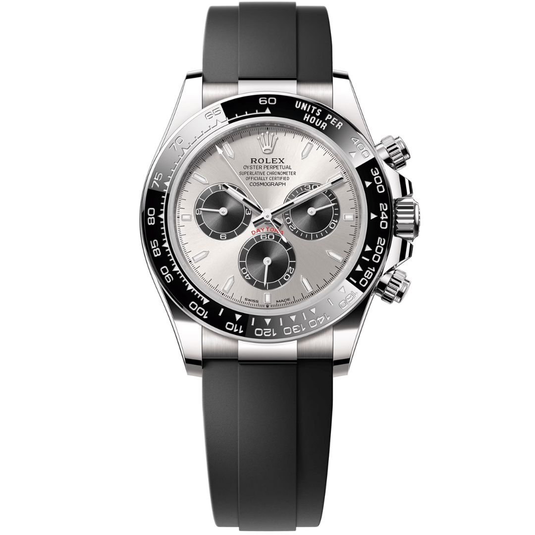 The Rolex Cosmograph Daytona 126519LN-0006 in white gold features a black Cerachrom bezel with tachymeter scale and contrasting steel-colored dial. Powered by caliber 4131 with chronograph function and 72-hour reserve, it embodies precision, prestige, and refined sportiness for those who appreciate heritage-driven performance and timeless luxury.