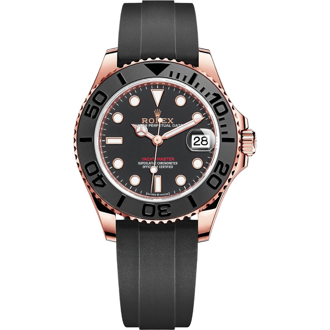 The Rolex Yacht-Master 37 268655 — An Everose gold sport-luxury icon with a bold black dial and matte Cerachrom bezel, offering exceptional legibility and modern refinement for those who seek confident, elevated everyday elegance.