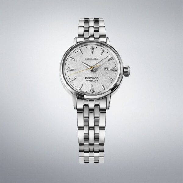 The Seiko Presage Cocktail Time Hot Buttered Rum SRE017J1 features a stainless steel case, white dial with diamond markers, and a reliable self-winding Caliber 2R05. Combining Japanese craftsmanship with refined elegance, it offers timeless sophistication for those who value style and everyday versatility.