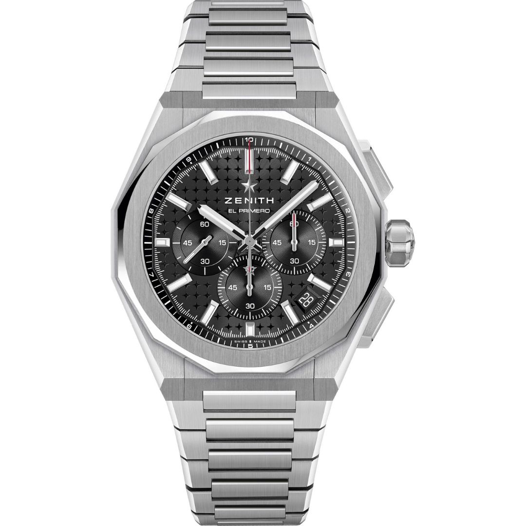 The Zenith Defy Skyline Chronograph 03.9500.3600/21.I001, crafted in stainless steel with a bold octagonal case and faceted bezel, features a patterned black dial. Powered by the El Primero 3600 automatic chronograph, it embodies modern precision, architectural design, and prestige for discerning collectors.